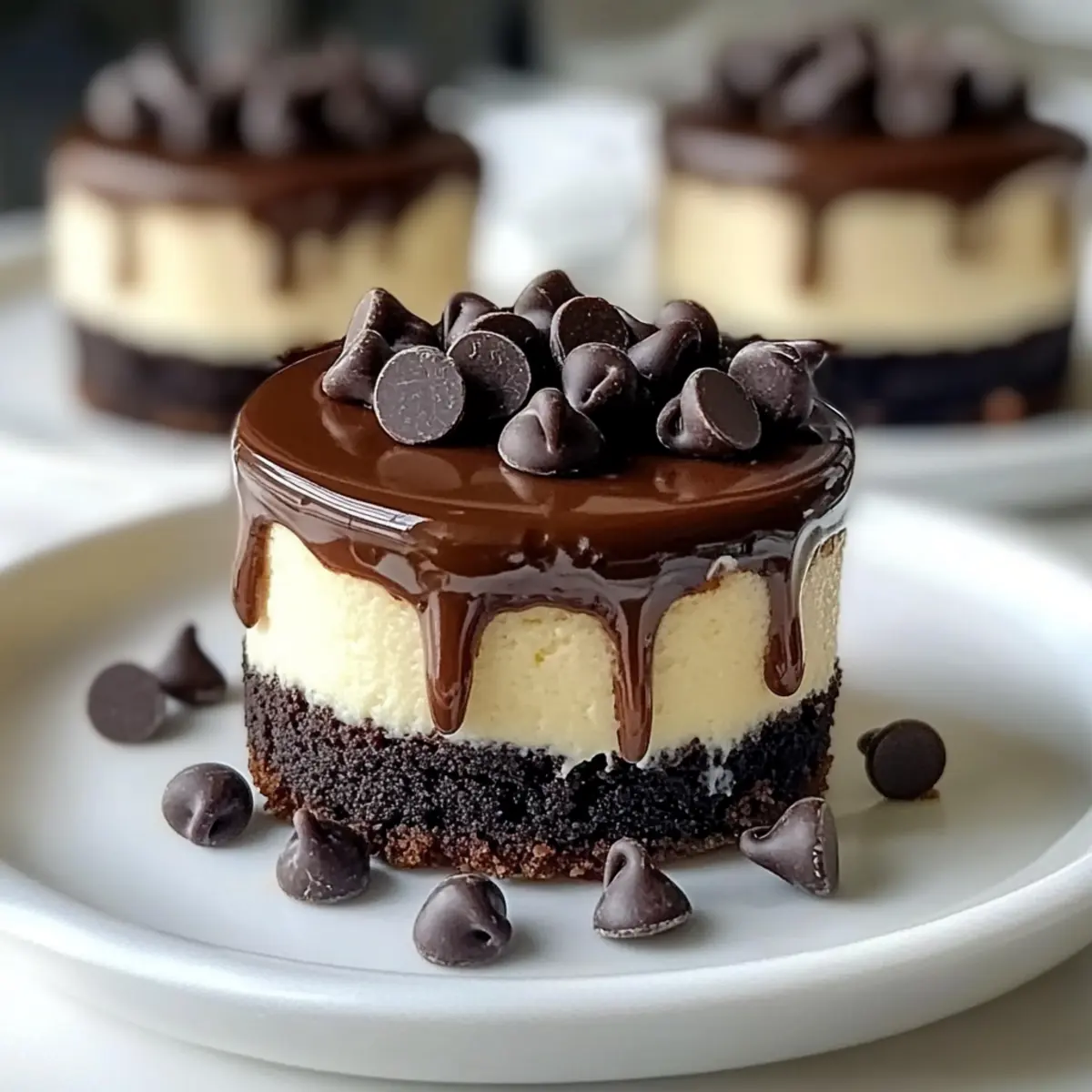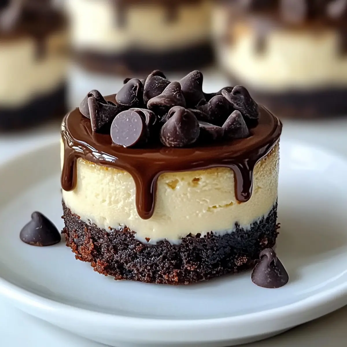 Once your ganache is ready, carefully spoon it over each chilled Brownie Bottom Mini Cheesecake, allowing it to cascade down the sides for a beautiful presentation. Top each cheesecake with a sprinkle of mini chocolate chips for added texture and flair. Chill again briefly before serving this indulgent treat to impress your guests!
