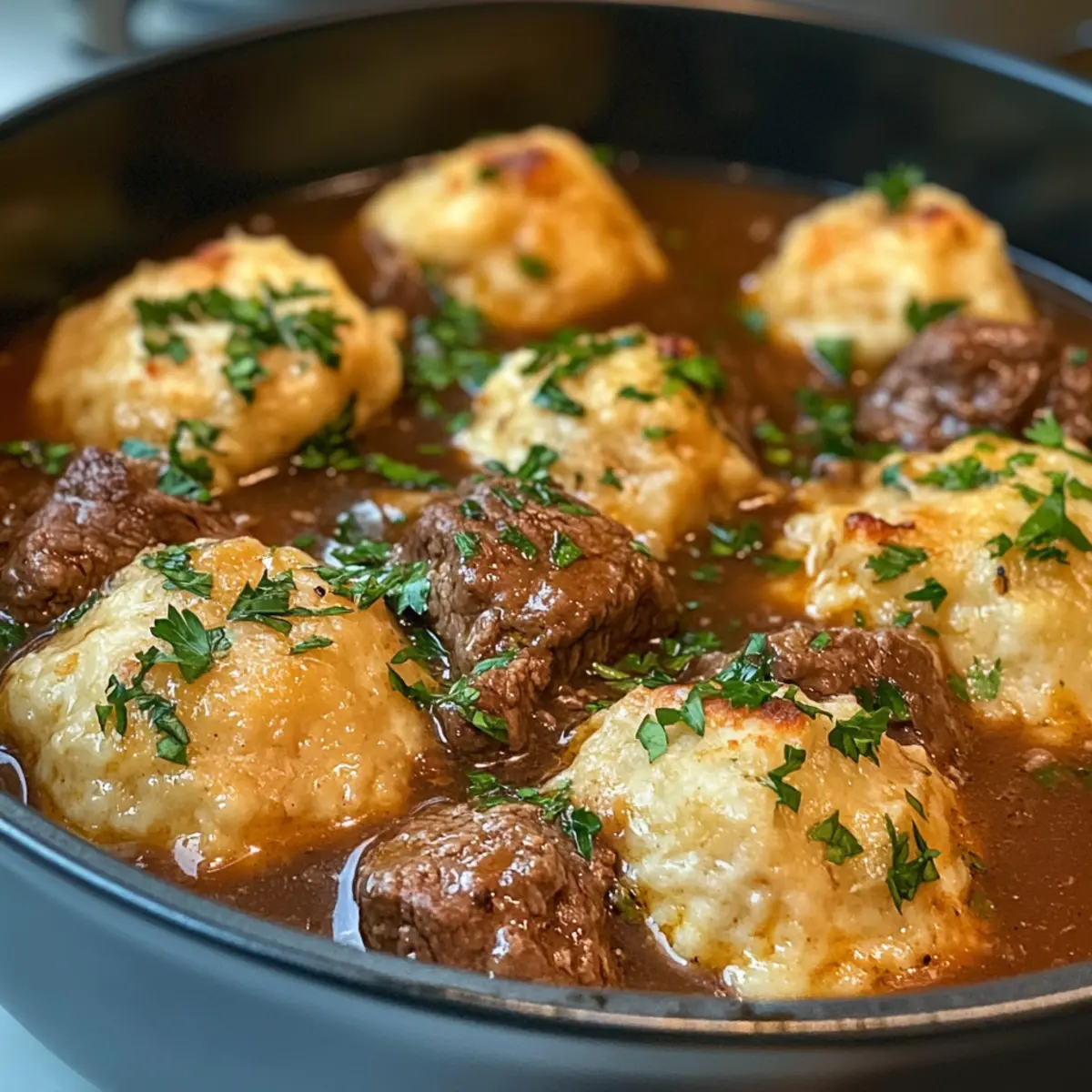 Hearty Beef Stew with Cheddar Herb Dumplings to Savor