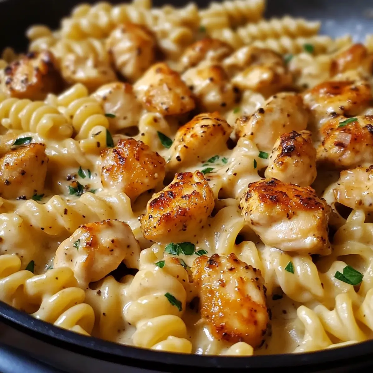 - Return the cooked chicken and drained rotini pasta to the skillet, gently tossing everything together in the luscious cheese sauce. Allow the mixture to simmer together for 2-3 minutes.