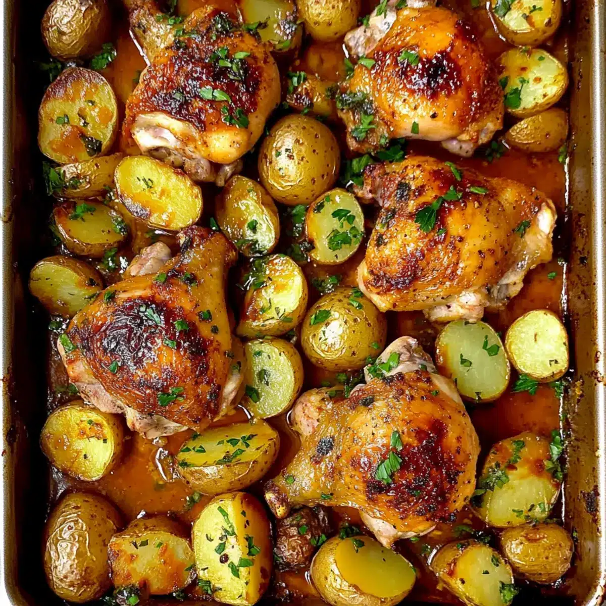 - Arrange the chicken and potatoes on a baking sheet and pour the sauce over them, ensuring they are well-coated.