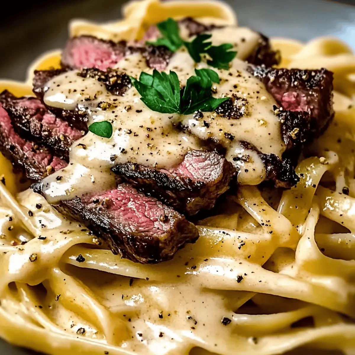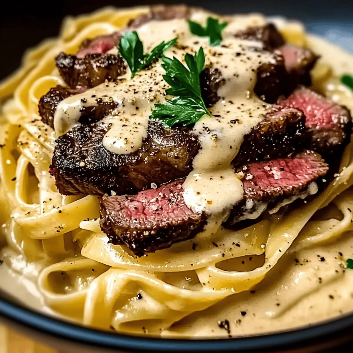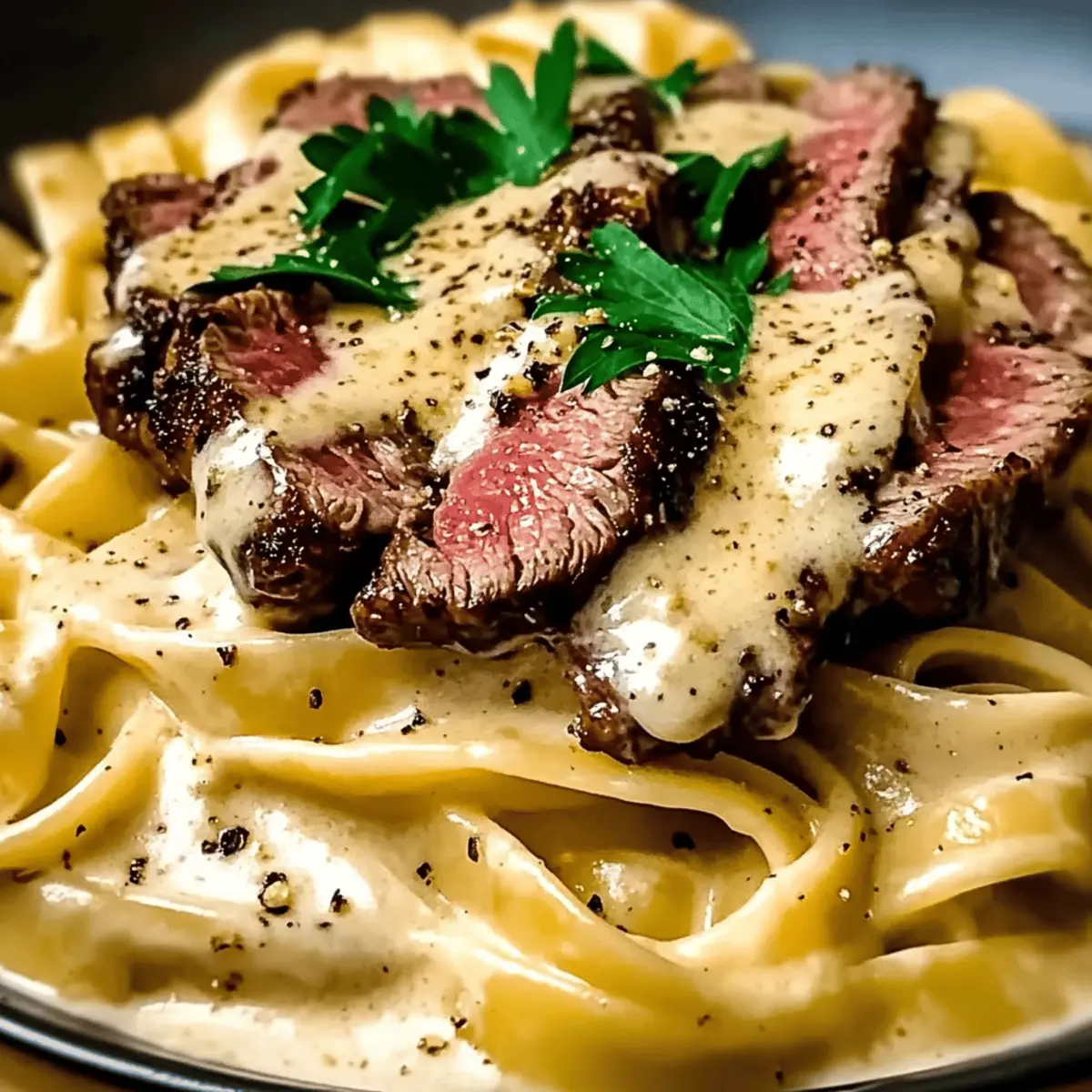 - Slice the rested steaks thinly. Plate the fettuccine and top with steak slices. Garnish with parsley and red pepper flakes.