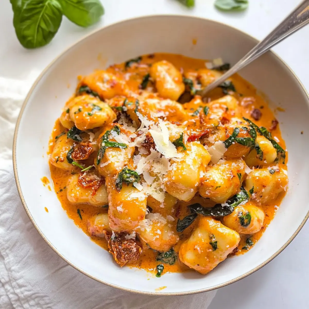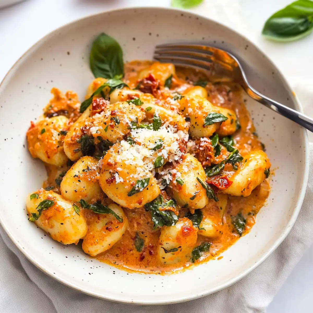 Now, add 2 cups of chopped baby spinach and a handful of fresh basil to the sauce. Stir until the greens are just wilted, about 1-2 minutes. This not only enhances the color of your dish but also boosts the nutritional value, making this Creamy Sundried Tomato Marry Me Gnocchi as wholesome as it is delicious.