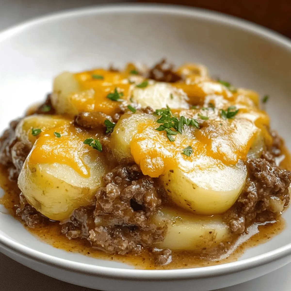 - Layer Ingredients in the Crockpot: Start with a layer of half the sliced potatoes at the bottom, followed by half of the cooked beef mixture and some cheddar cheese. Repeat with remaining ingredients.