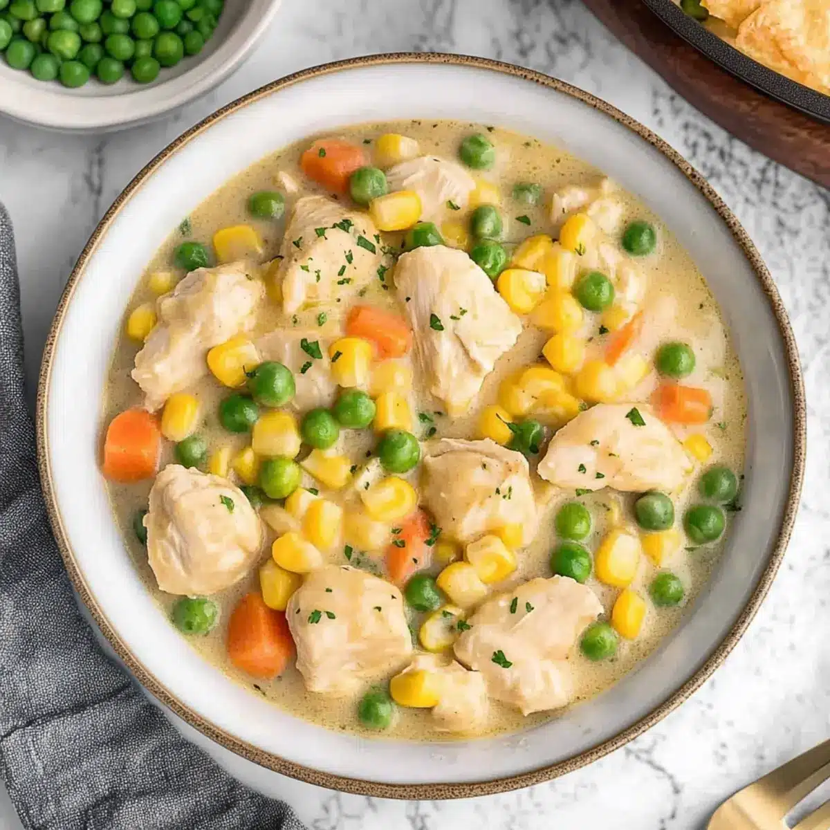 Finally, gently fold in the thawed and drained frozen peas and corn, allowing them to heat through for about 2 minutes. Ensure everything is well mixed, and the filling is piping hot before serving. The vibrant colors and creamy texture will be sure to please everyone at the table!