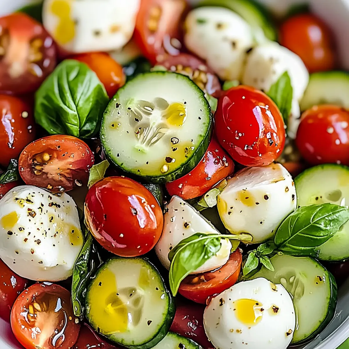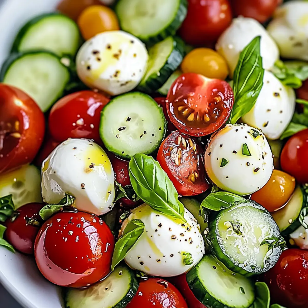 Absolutely! You can prep the ingredients—slice cucumbers, halve tomatoes, and drain mozzarella—up to a few hours ahead of time. Store them separately in an airtight container in the refrigerator. Just be sure to assemble and dress the salad right before serving to keep it fresh and delicious!