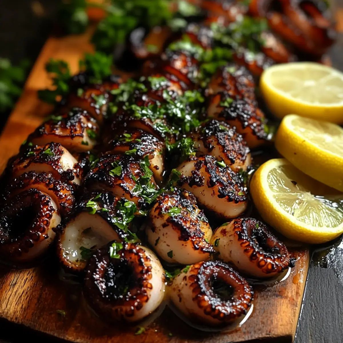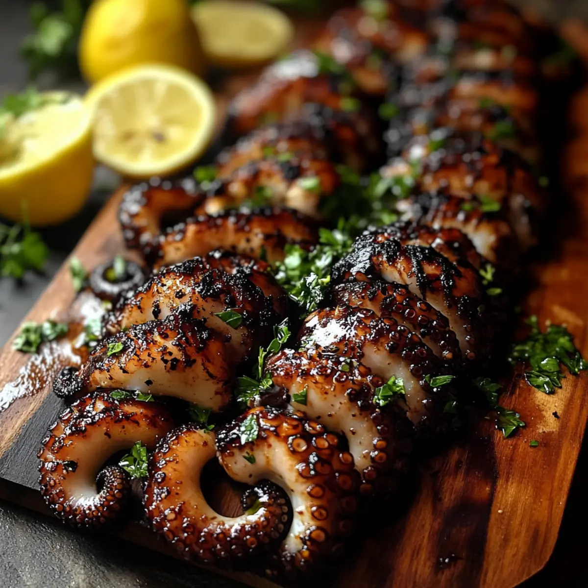 Once grilled, let the octopus rest for about 5 minutes to retain its juiciness. Drizzle the reserved vinaigrette over the octopus, adding a burst of flavor, then sprinkle with fresh parsley. Serve alongside lemon wedges to squeeze over each piece, making for a stunning presentation that will impress your guests with this delightful seafood dish.