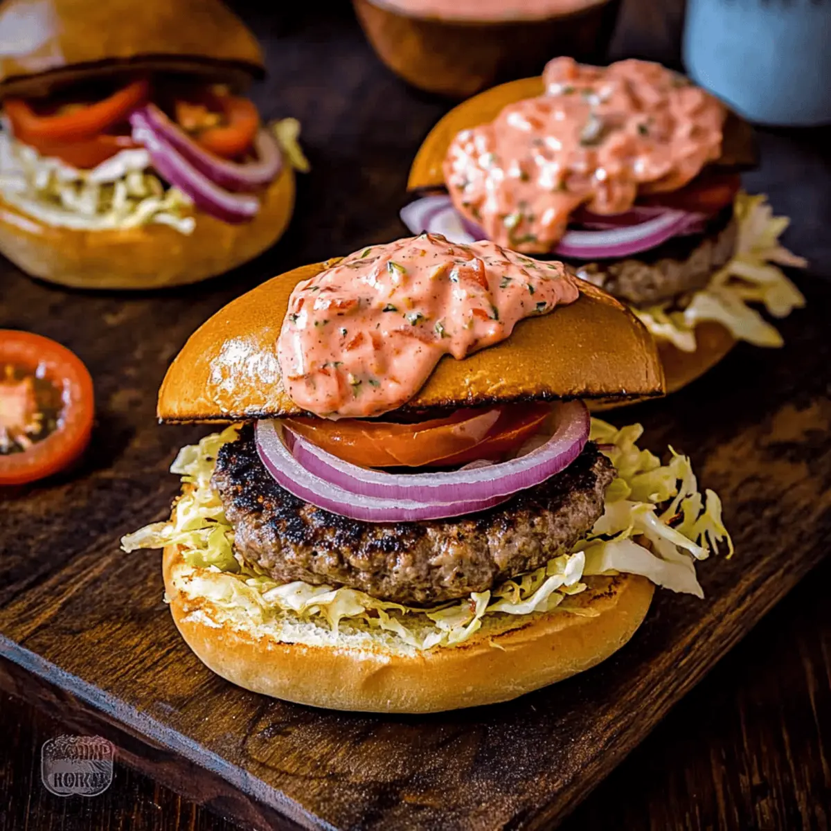 - Add the Pink Sauce: Drizzle generous amounts of pink sauce over the burgers.