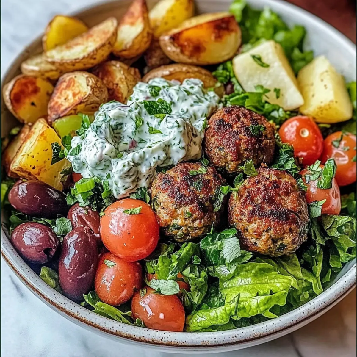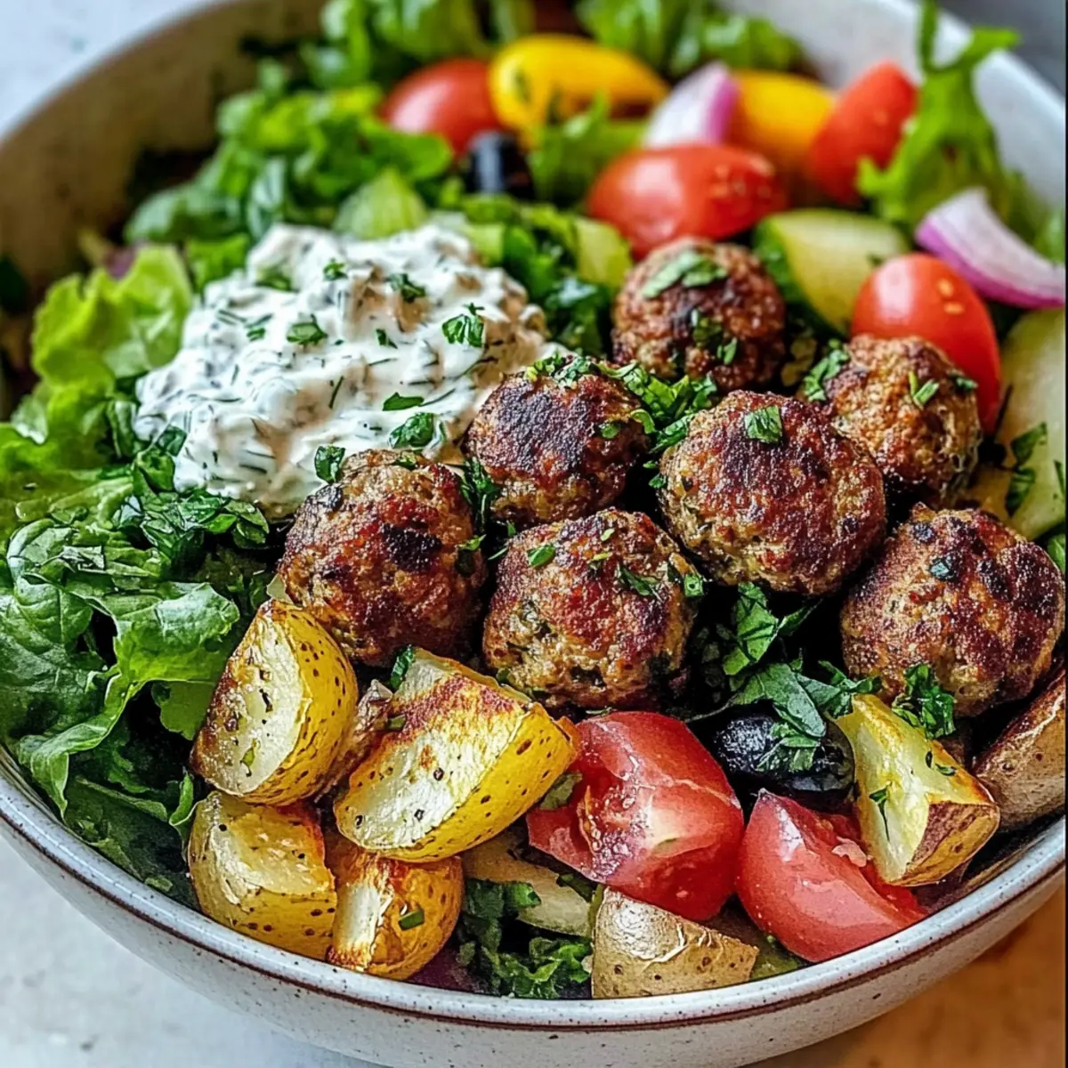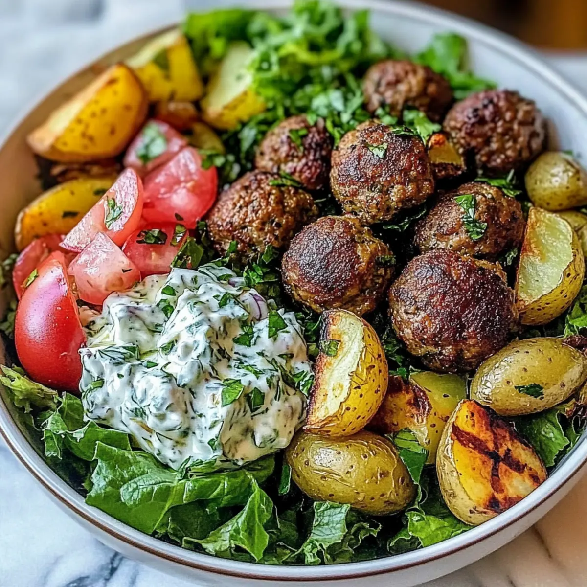 - Layer chopped lettuce in bowls. Add roasted potato wedges, meatballs, and salad ingredients. Drizzle with tzatziki and garnish with herbs.