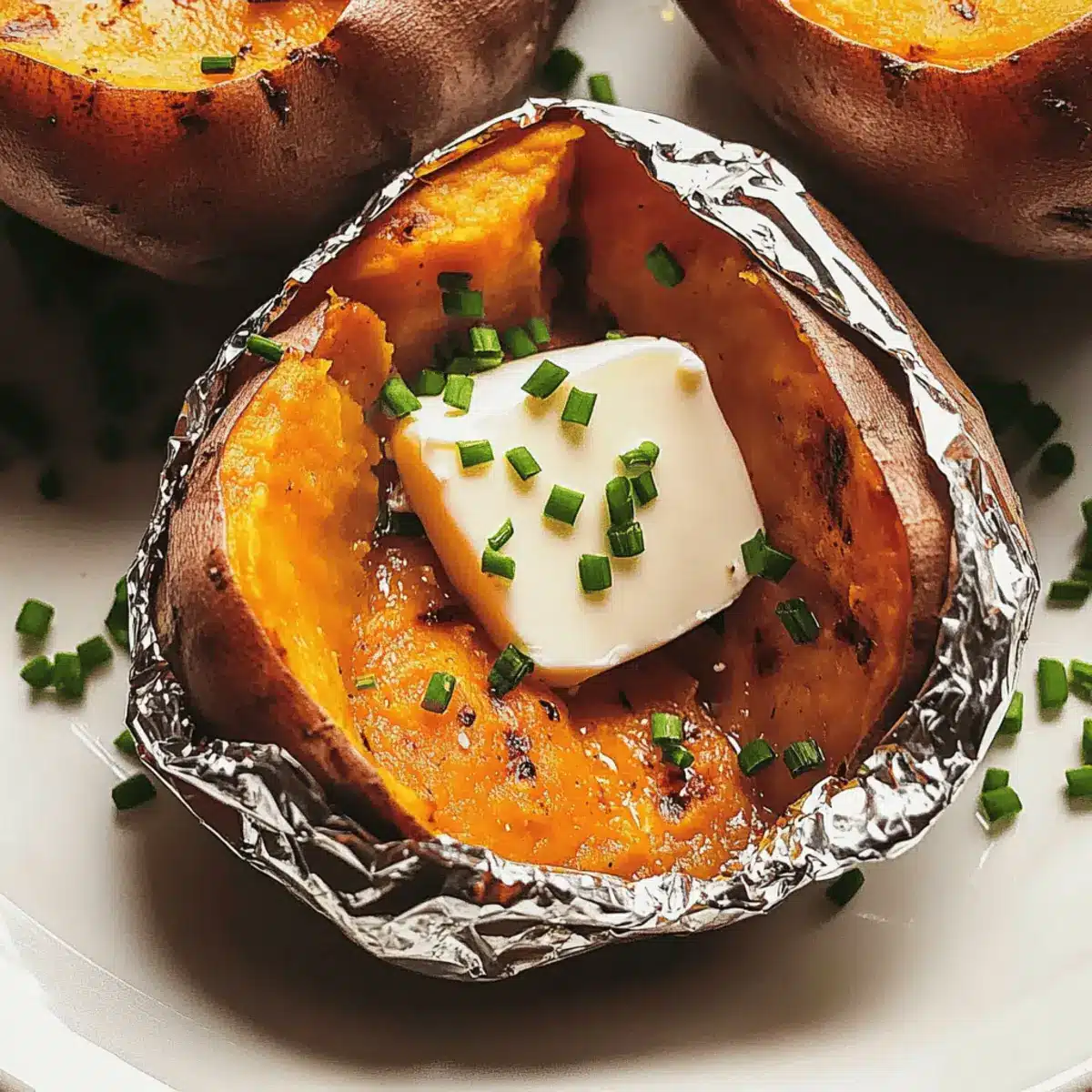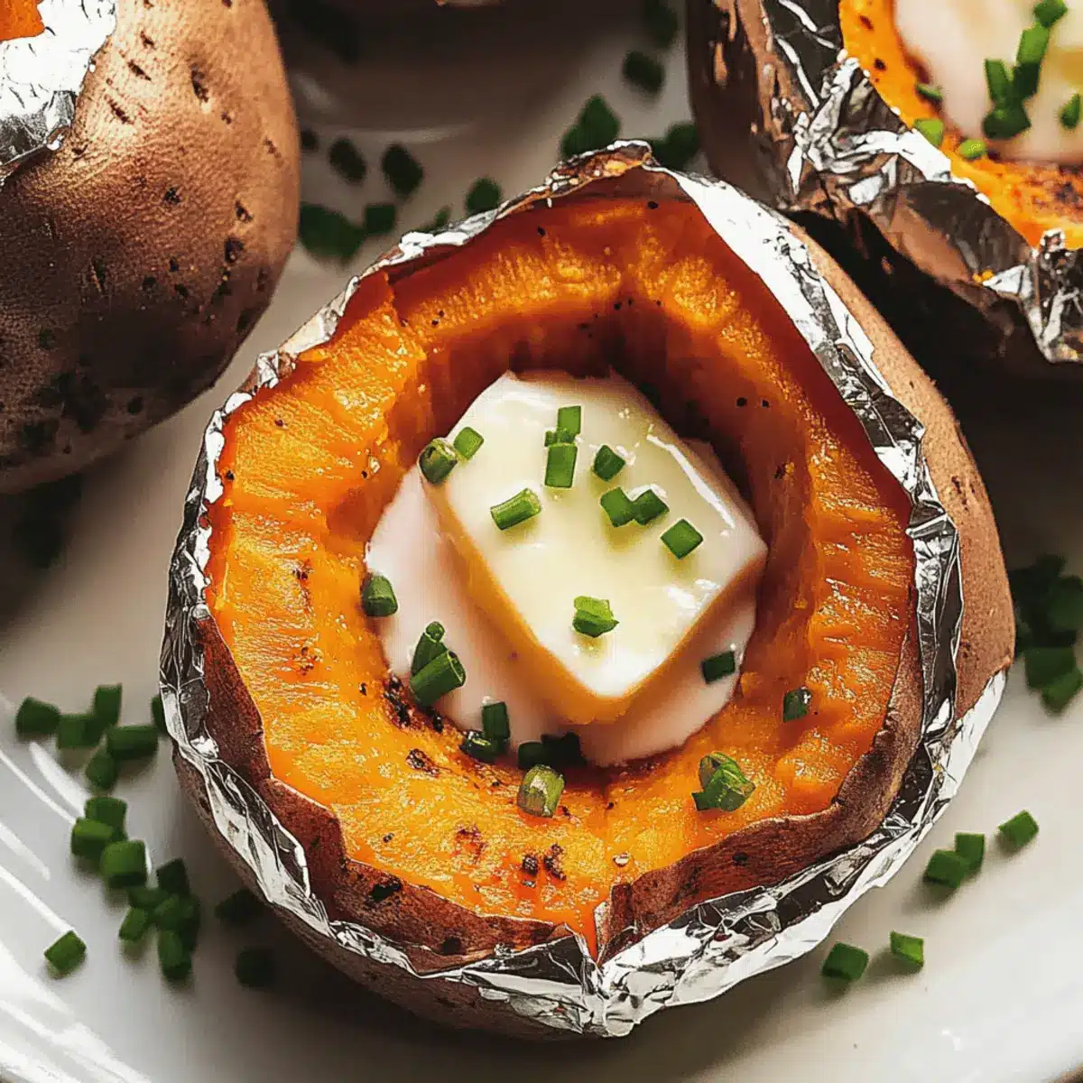 Once your Grilled Sweet Potatoes are tender and perfectly cooked, remove them from the grill and let them cool slightly. Slice them open, then add a pat of butter for richness, a sprinkle of salt to elevate the flavors, and finish with a handful of freshly chopped chives for a burst of color and fresh taste.