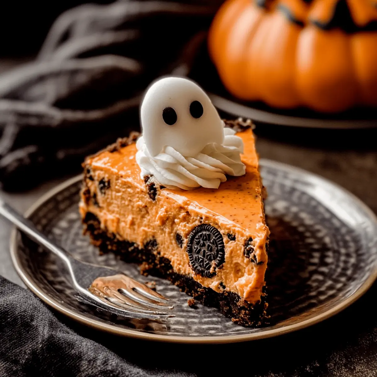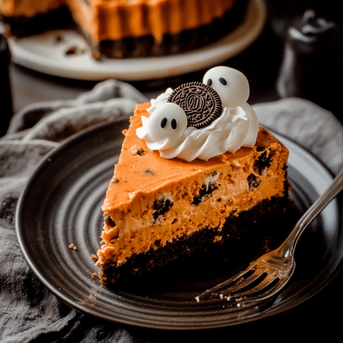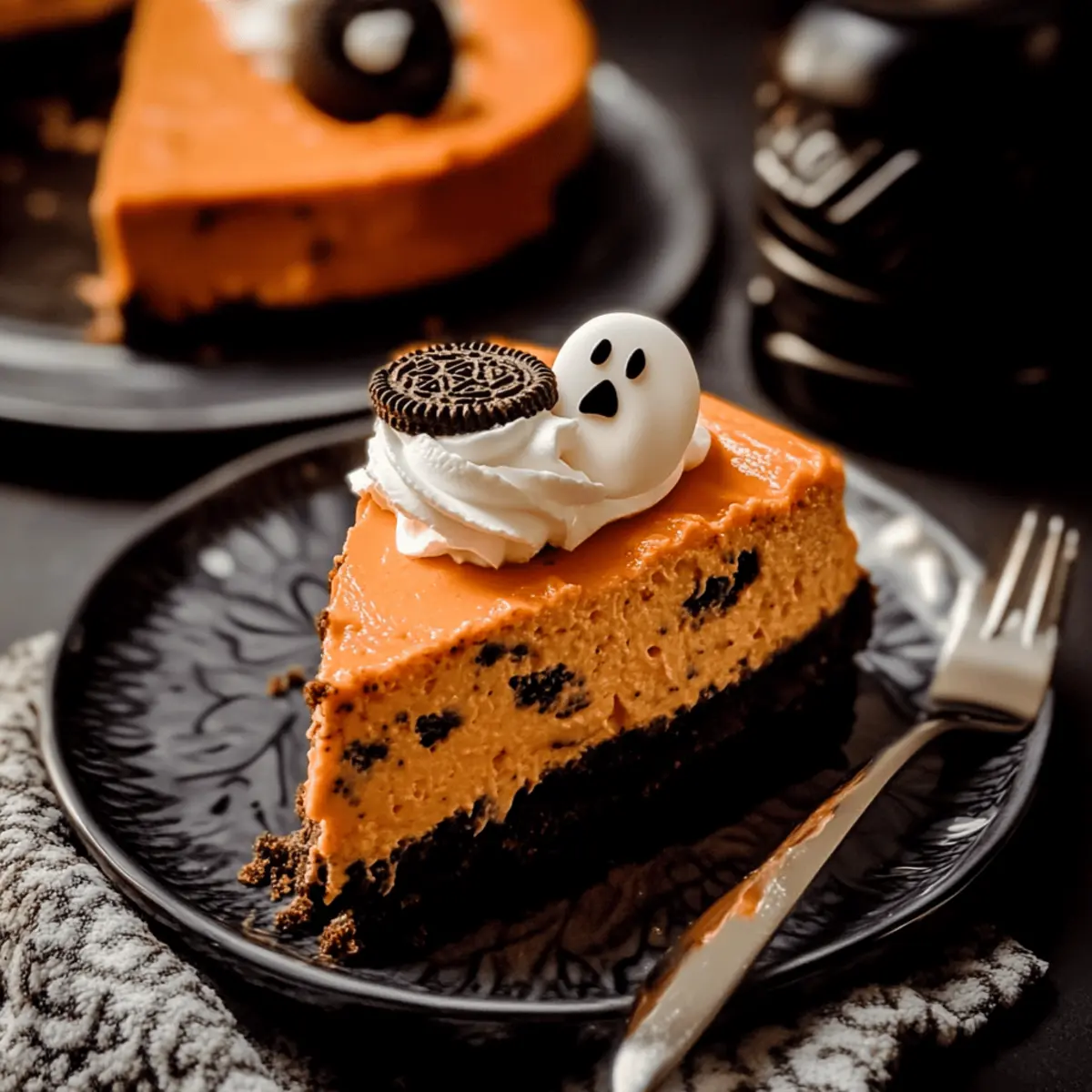 Once chilled, gently run a knife around the edge of the springform pan to loosen the cheesecake, then carefully remove the sides. Decorate the top with whipped cream ghost shapes and candy eyes for a spooky touch. Your Halloween Cheesecake is now ready to share and dazzle your guests at any Halloween celebration!