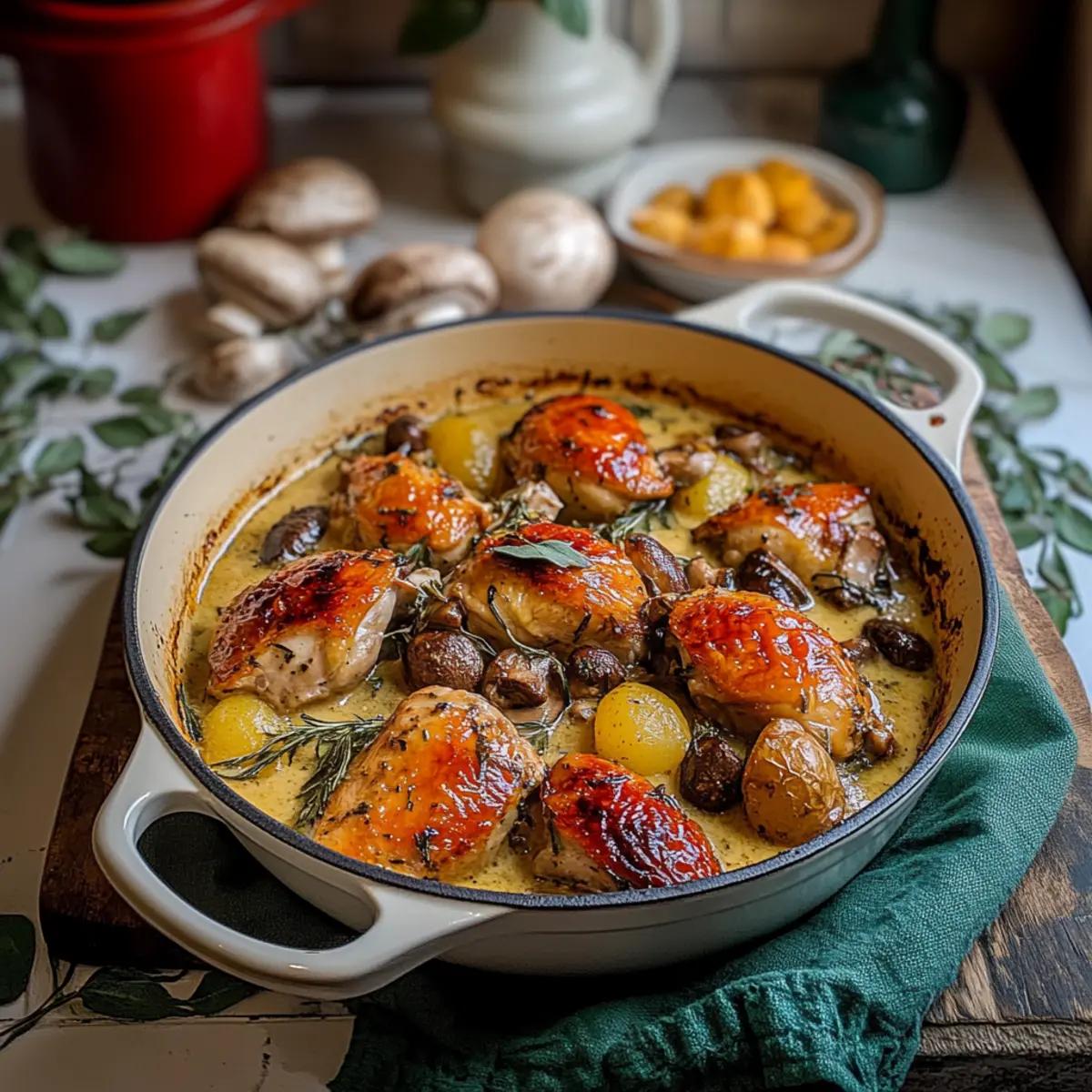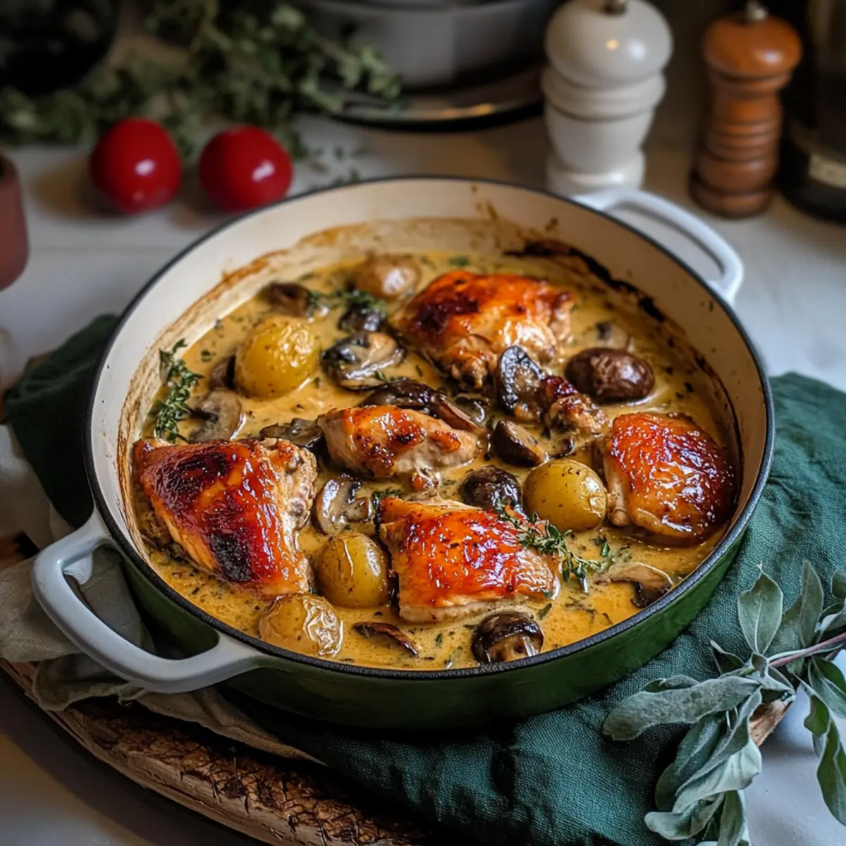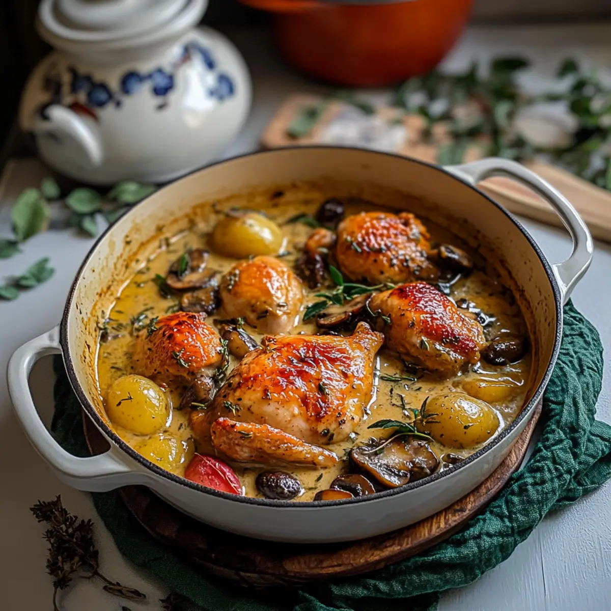 These Herb Roasted Chicken in Creamy White Wine Sauce are perfect for meal prep warriors! You can cut and season the chicken up to 24 hours in advance, simply refrigerate it in an airtight container to keep it fresh. Additionally, you can sauté the vegetables and prepare the creamy sauce, storing them separately in the fridge for up to 3 days. When you’re ready to cook, just combine the chicken with the prepped ingredients, nestle them into your Dutch oven, and roast as directed. The dish will be just as delicious and save valuable time on busy weeknights, allowing you to enjoy stress-free cooking with minimal effort!