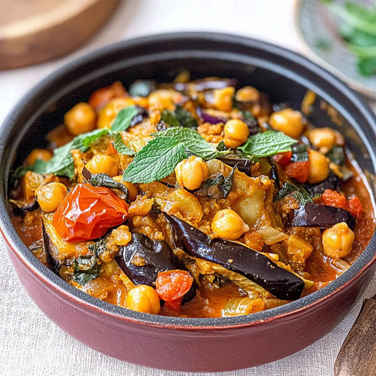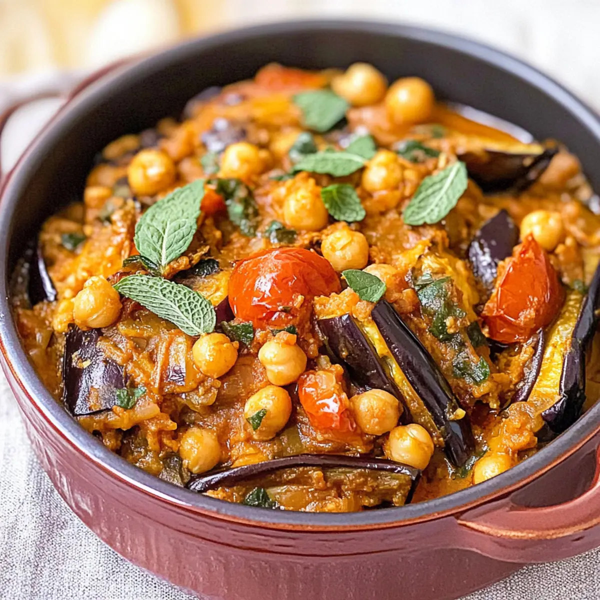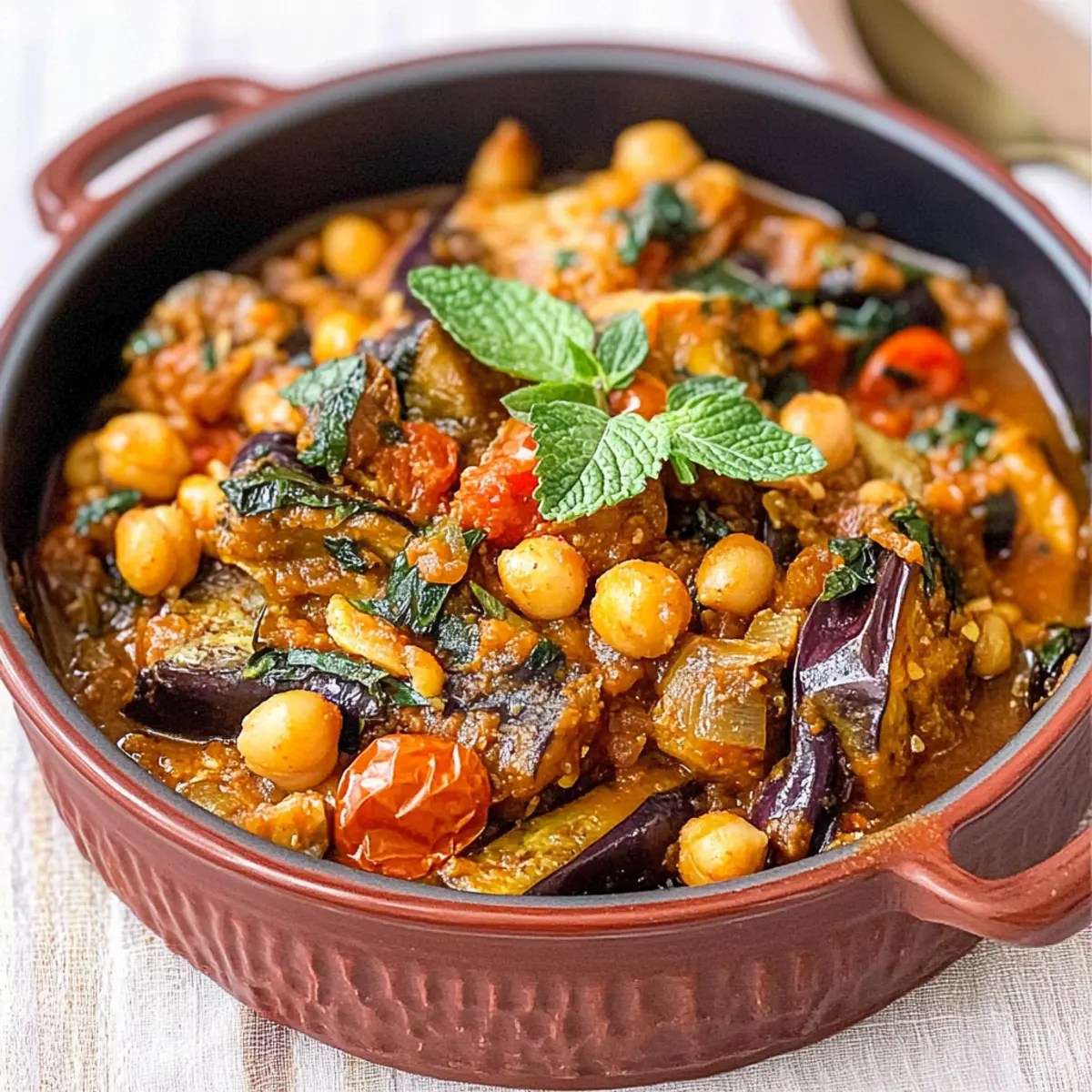 - Combine the roasted eggplants and chickpeas with the tomato mixture, adjusting the consistency with water as needed.