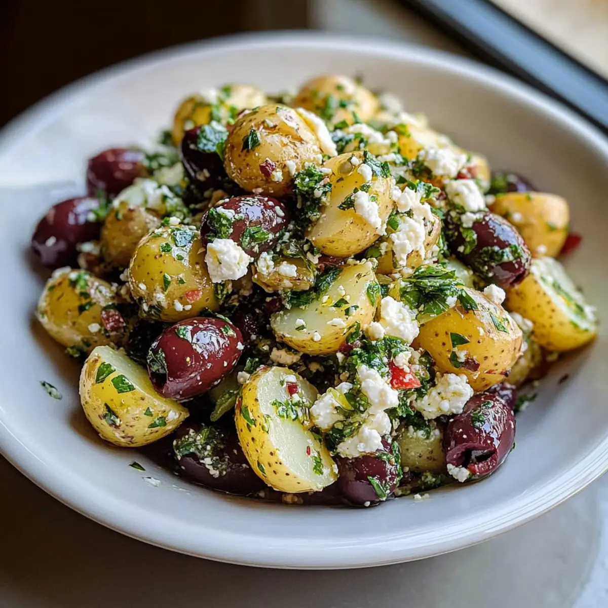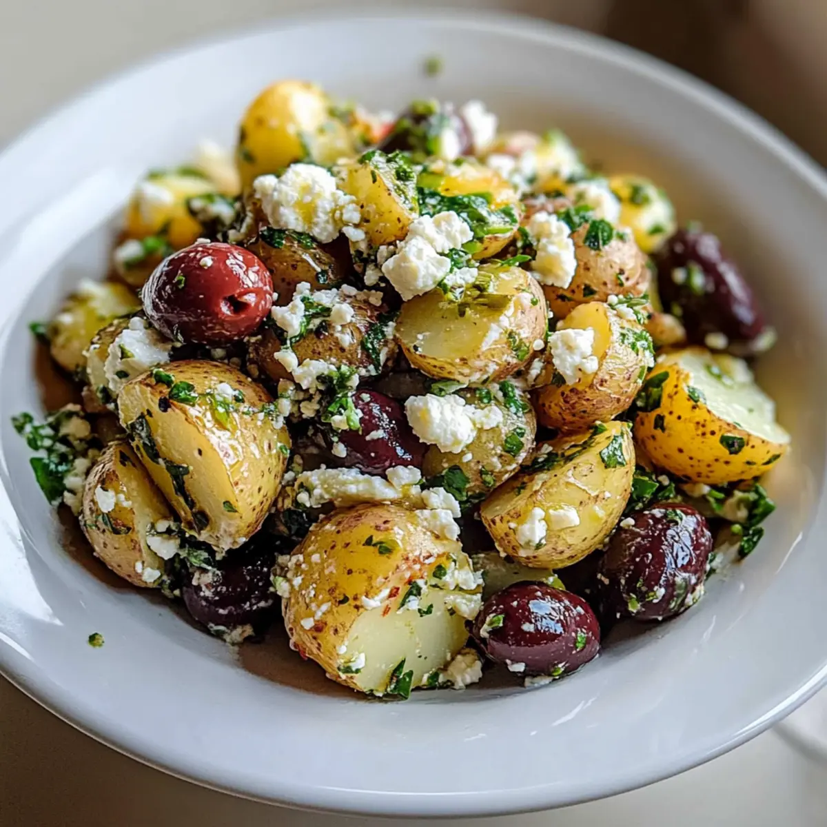 - In a large bowl, combine cooled potatoes, Kalamata olives, green olives, crumbled feta, fresh dill, and parsley. Drizzle with dressing and toss gently to combine.