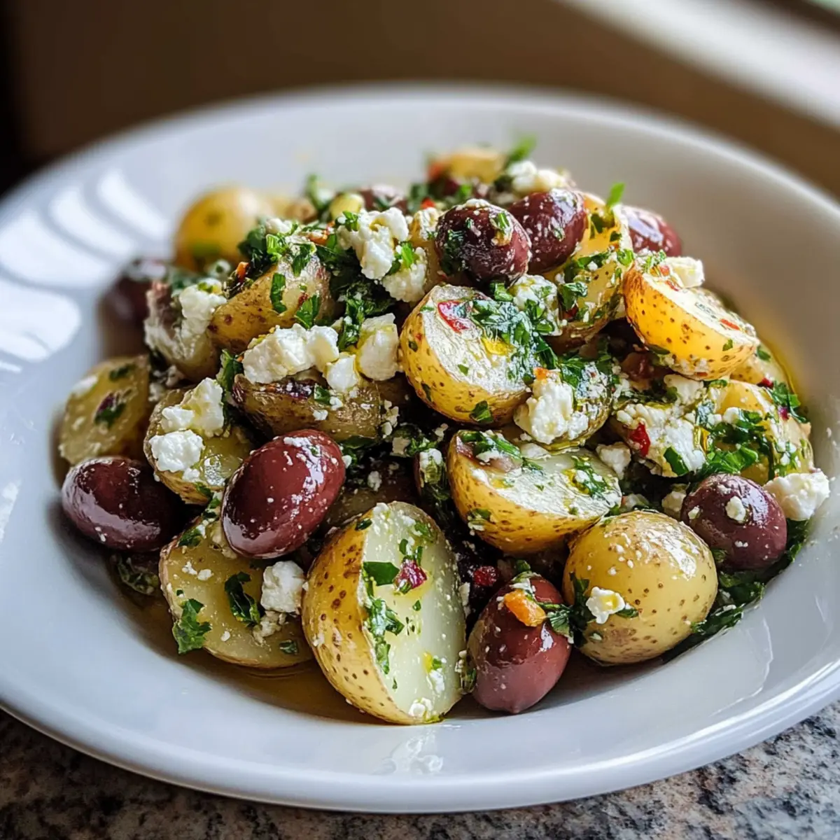 These Mediterranean Potato Salad preparations are a lifesaver for busy home cooks! You can boil and cool the potatoes up to 24 hours in advance, storing them in an airtight container in the refrigerator. Additionally, you can mix the dressing—combining olive oil, lemon juice, red wine vinegar, Dijon mustard, and garlic—and keep it ready for up to 3 days in the fridge. Just remember to refrigerate the olives and feta separately before assembly. When it’s time to serve, simply toss everything together with the dressing, and your flavorful Mediterranean potato salad will be just as delicious as when made fresh! This make-ahead approach not only saves time but also enhances the flavors.