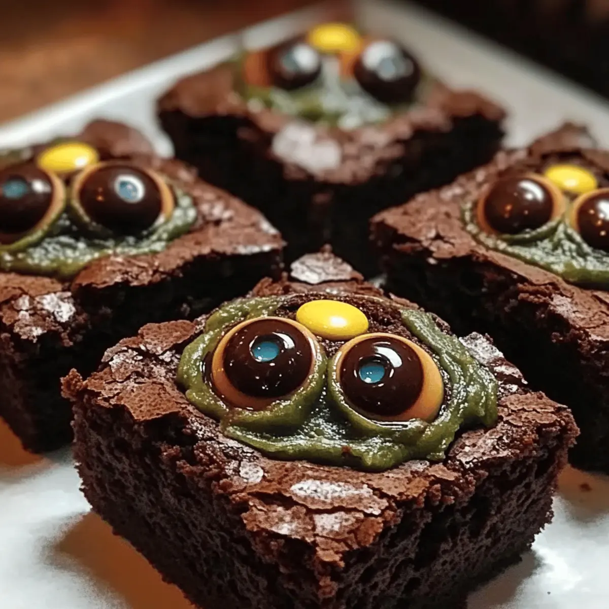 - Spread the green frosting into the indented centers of each brownie and top with a candy eyeball.