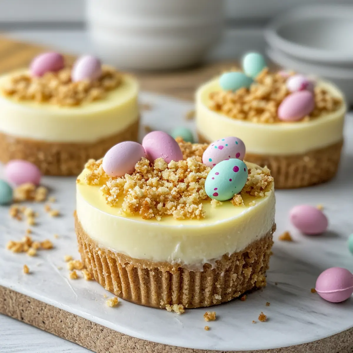 Just before serving, remove your No Bake Mini Egg Cheesecakes from the fridge and sprinkle the crushed mini eggs on top of each cheesecake for a festive touch. This colorful garnish not only adds visual appeal but also provides a delightful crunch. Serve immediately for the best texture enjoyment, and watch as your guests revel in this delicious Easter treat!