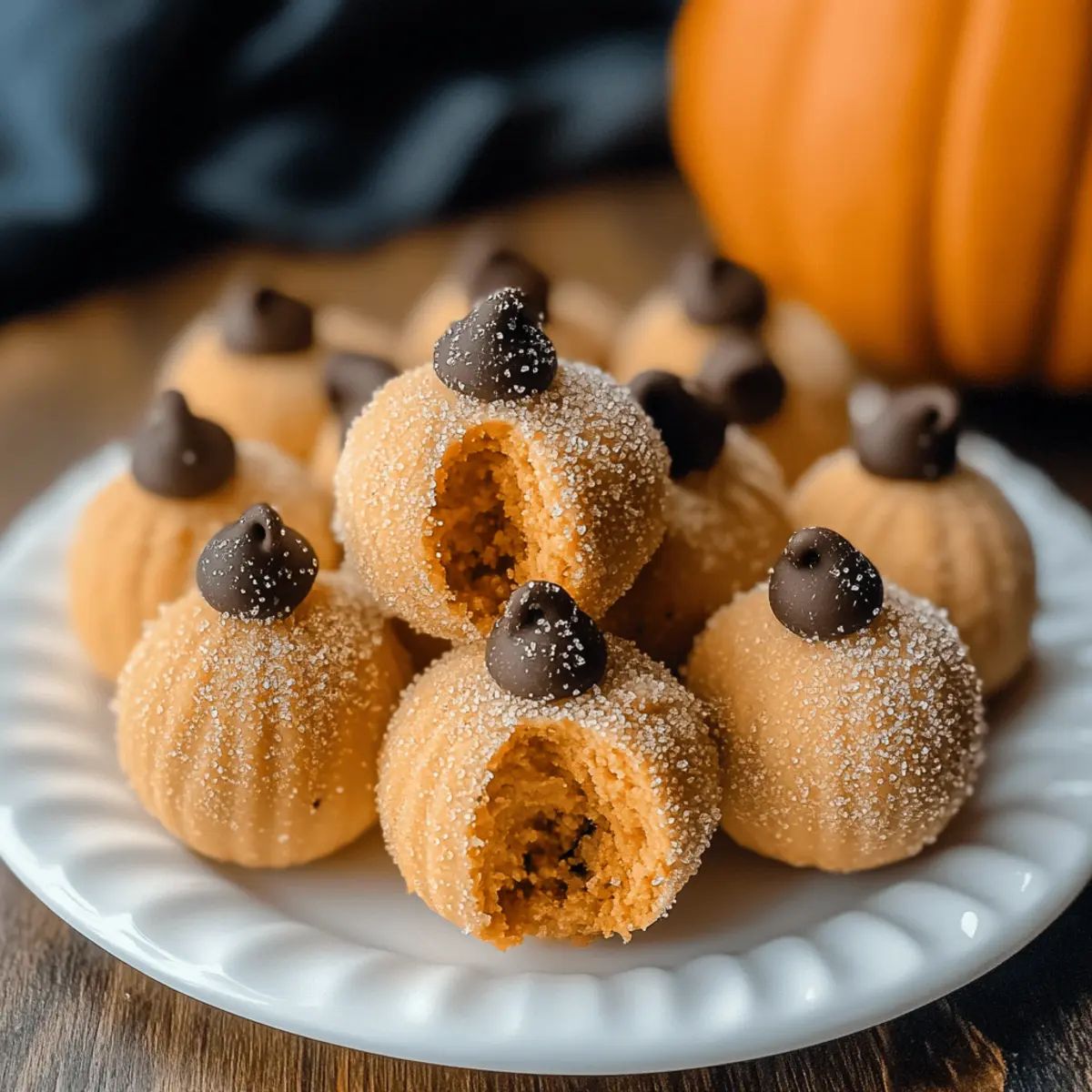 - Roll each truffle in granulated sugar, and place a chocolate chip on top of each truffle to resemble a pumpkin stem.