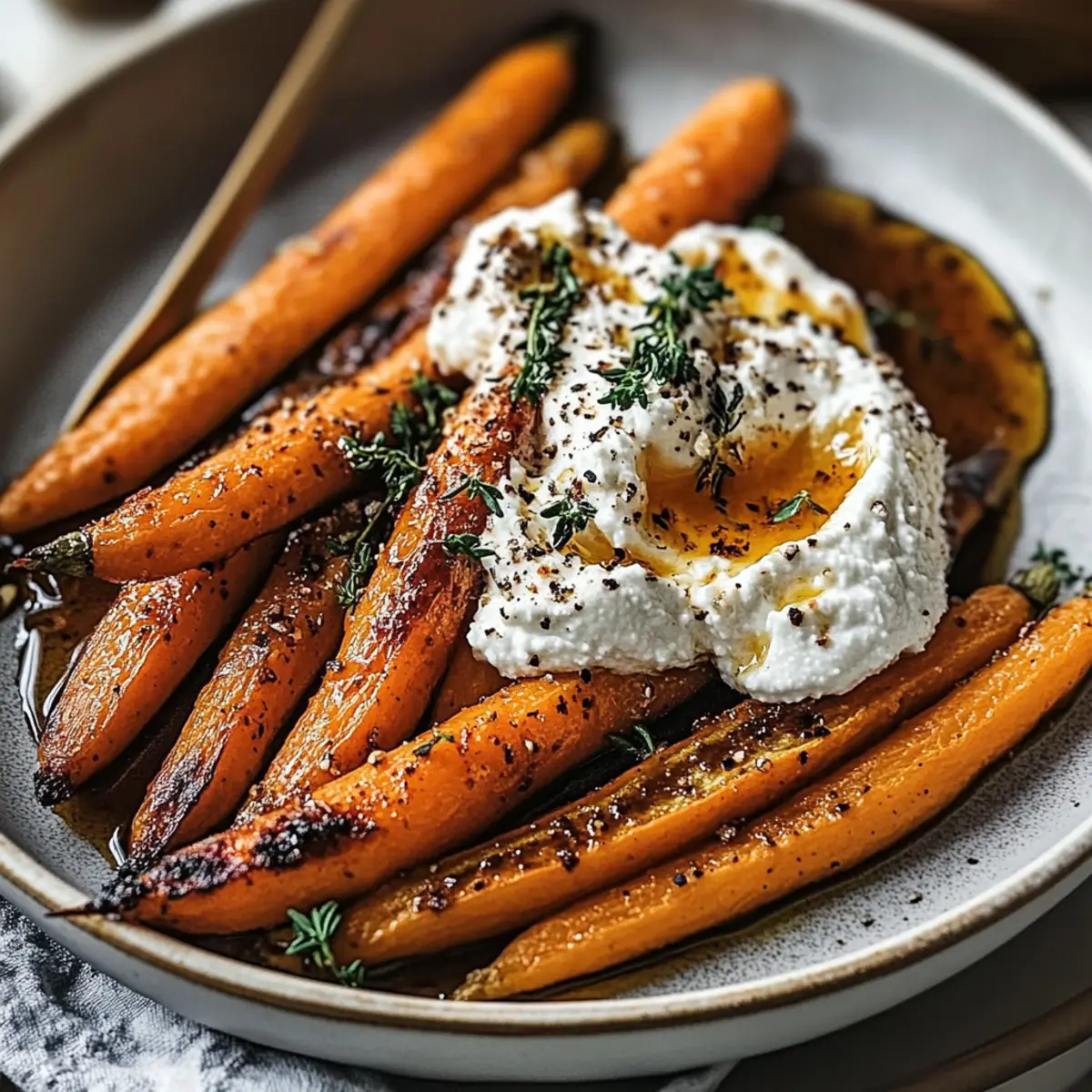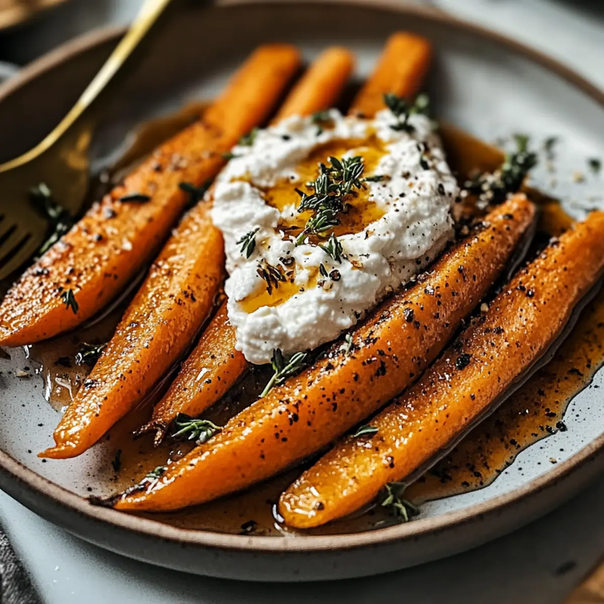 Once the carrots are beautifully roasted, remove them from the oven and transfer them to a serving platter. Spoon the whipped ricotta onto the plate and nestle the roasted carrots on top. Drizzle generously with the spicy honey glaze, and finish by garnishing with fresh herbs like thyme or parsley. Your Roasted Carrots with Whipped Ricotta and Spicy Honey are now ready to impress!