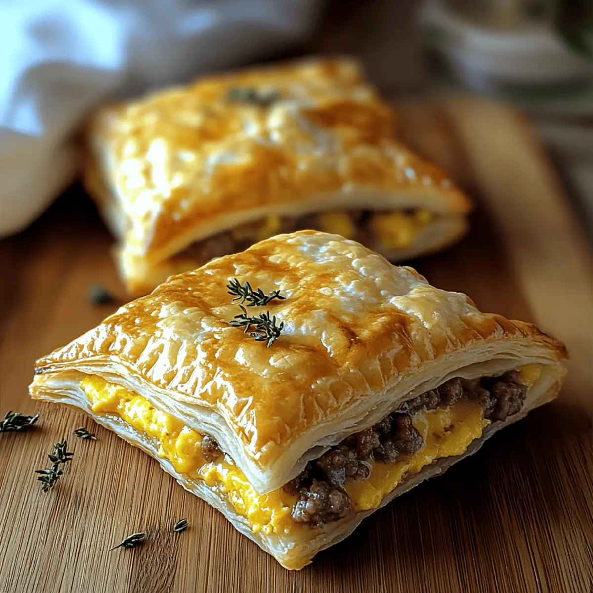 - On a baking sheet lined with parchment, brush edges of one rectangle with egg wash, fill with scrambled eggs and sausage gravy, top with another rectangle, and seal the edges.