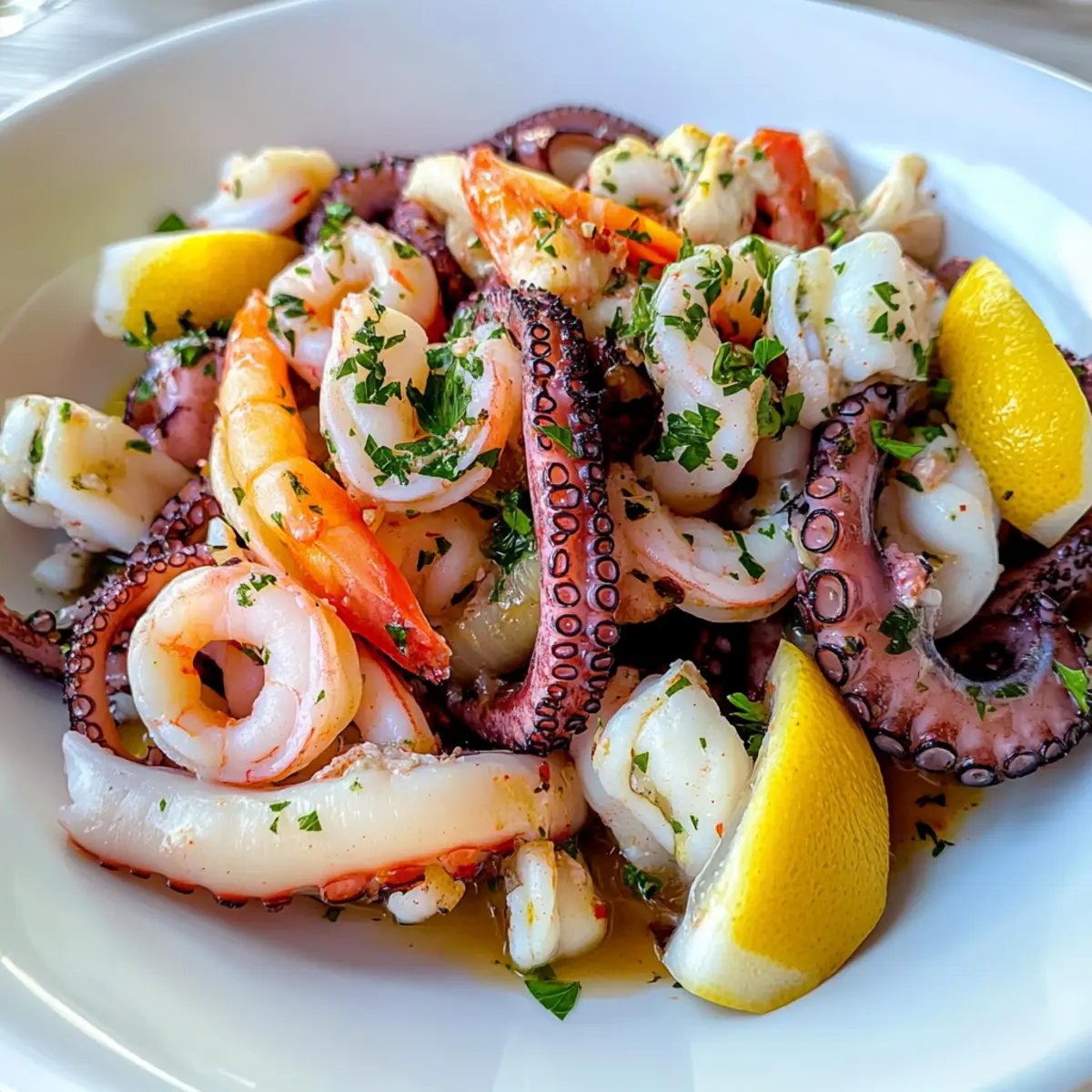 In a large serving bowl, combine the chopped octopus, poached squid, and shrimp. Drizzle the prepared dressing over the seafood and gently toss everything together, ensuring each piece is coated evenly. The colors and aromas will meld beautifully, reflecting the sunshine of the Mediterranean in your Italian Seafood Salad.