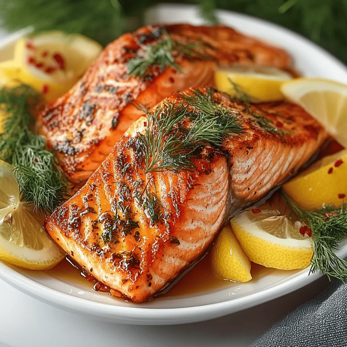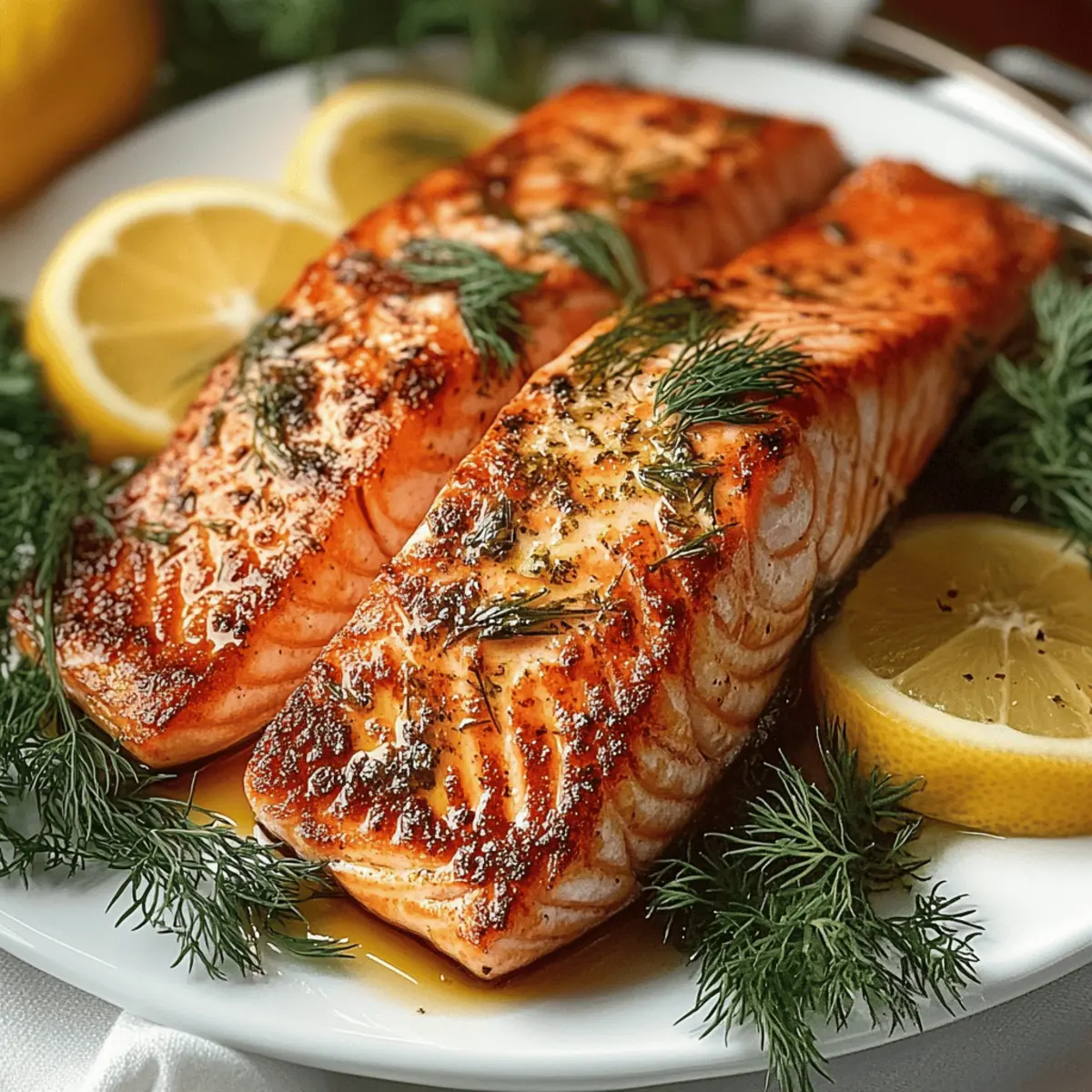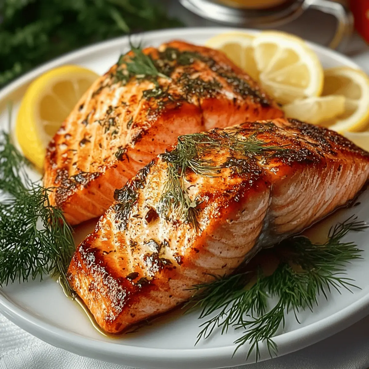 - Plate the salmon, garnishing with extra dill and lemon wedges, and serve immediately.