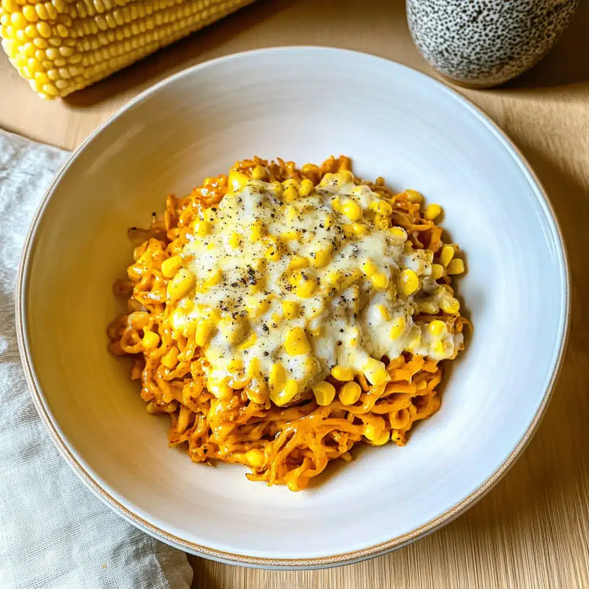 - Remove the pan from the heat and let it sit for a couple of minutes. Then, layer the hot cheesy corn mixture generously over the cooked spicy noodles, ensuring each noodle is coated.