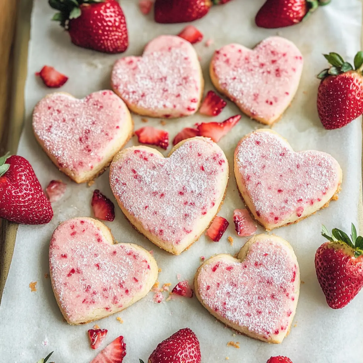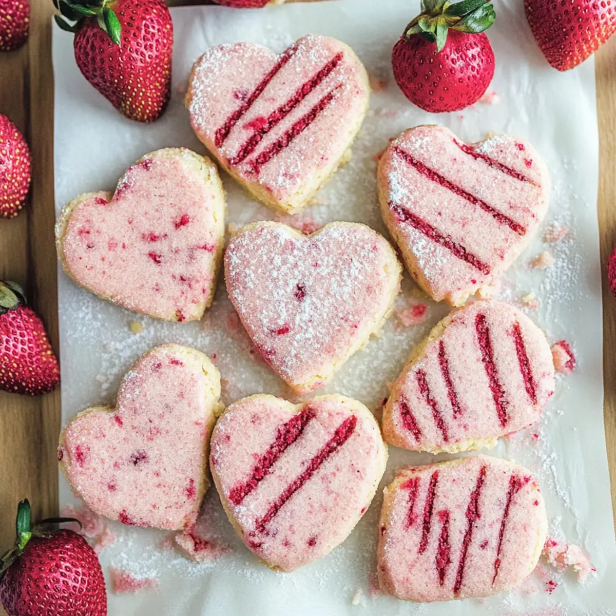These Strawberry Shortbread Cookies are perfect for busy home cooks who want to save time without sacrificing flavor! You can prepare the cookie dough up to 24 hours in advance: just form it into a disc, wrap it tightly in plastic wrap, and refrigerate. If you want to take it a step further, you can even cut the cookies into heart shapes and place them on a baking sheet ready to bake, storing them covered in the fridge for the same time frame. When you’re ready to bake, simply pop them in a preheated oven and follow the original instructions for that delightful, fresh-baked taste that is just as irresistible! Make your baking routine easier and enjoy these cookies at a moment’s notice!