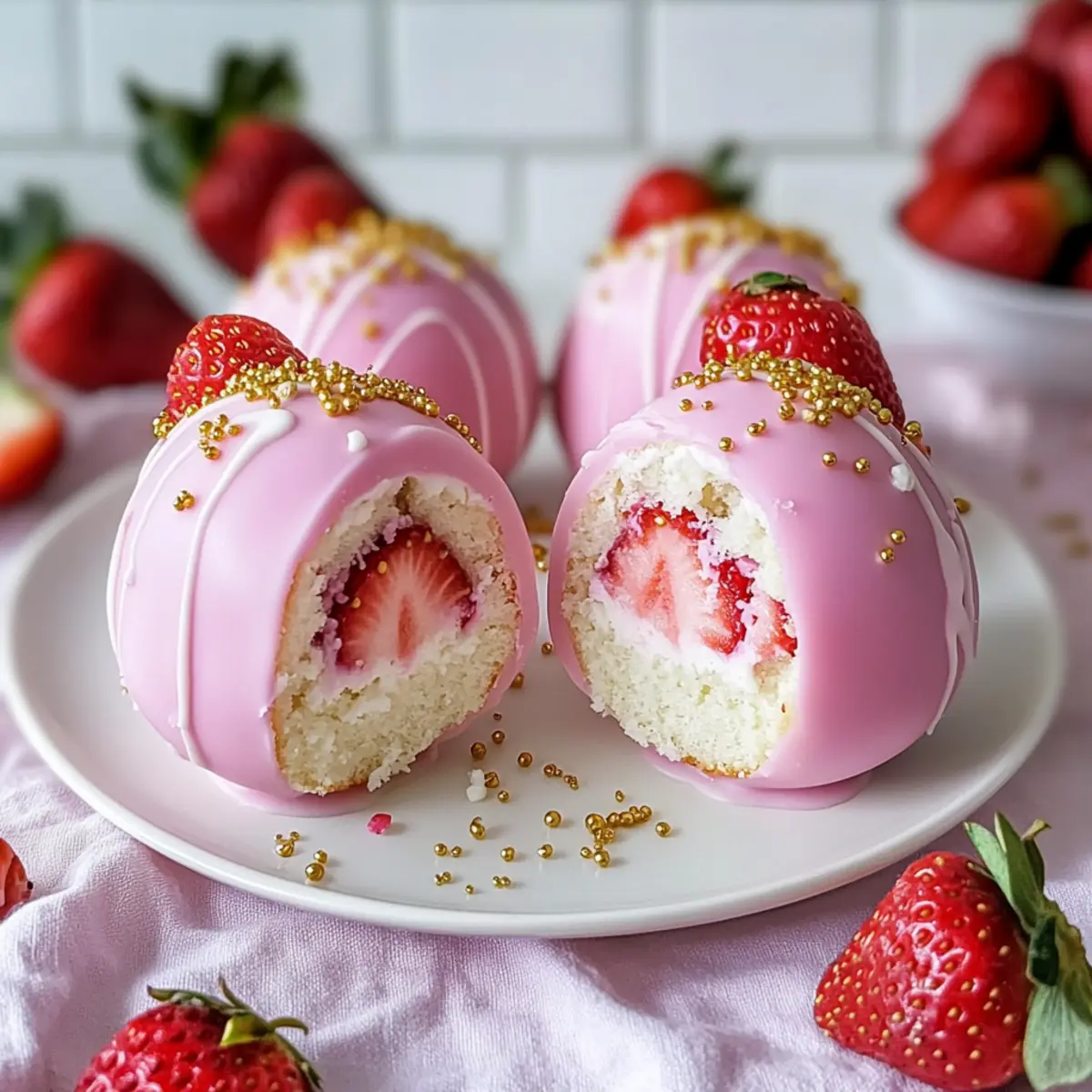 - Drizzle melted pink chocolate over the tops, add fresh strawberry slices, and sprinkle with edible gold sprinkles.