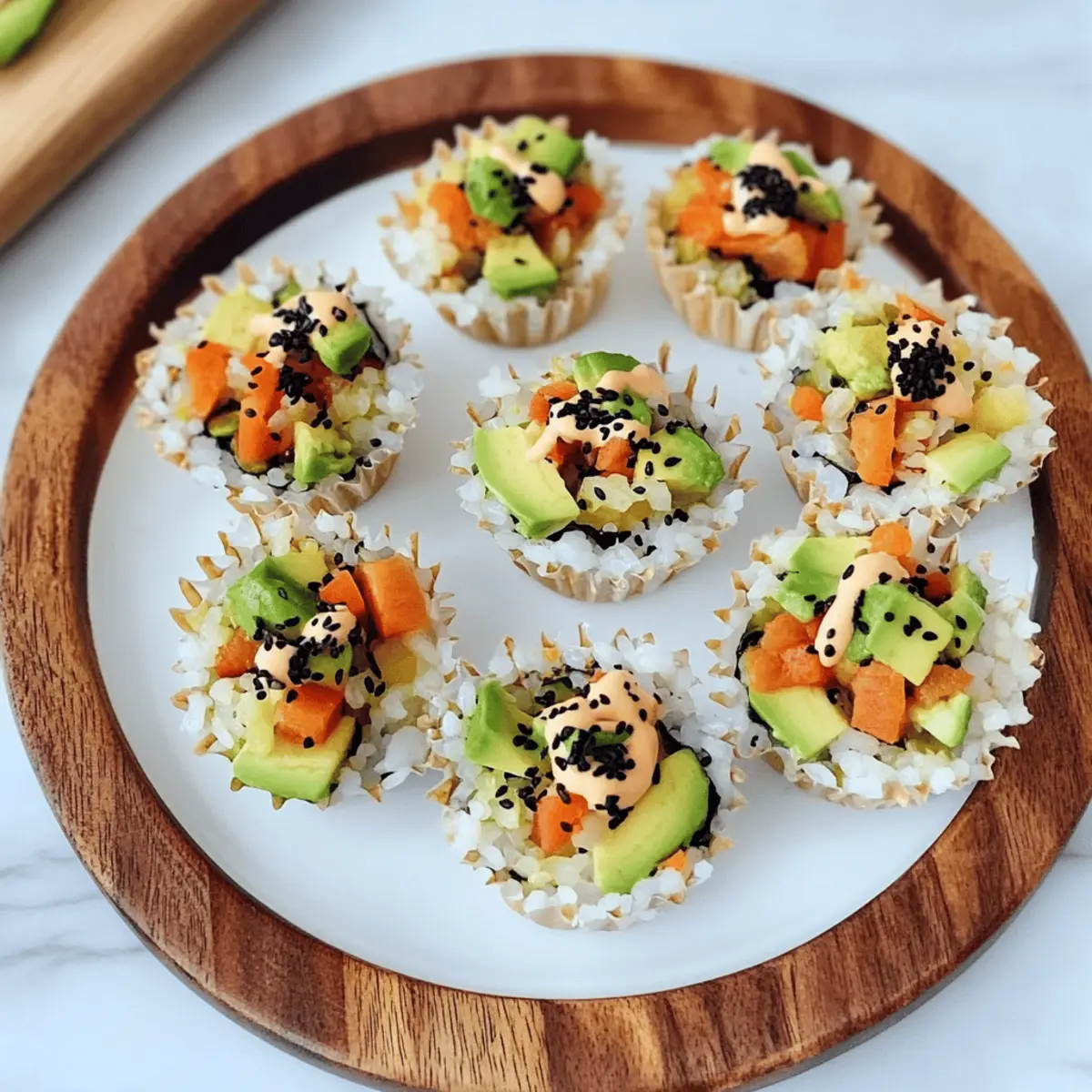 Carefully remove the chilled rice cups from the muffin liners and place them on a serving platter. Spoon an ample amount of the veggie mixture into each rice cup, ensuring they’re generously filled. Drizzle the spicy mayo over the top and sprinkle with black sesame seeds for a delightful finish that adds both flavor and a visual appeal to your sushi cups.