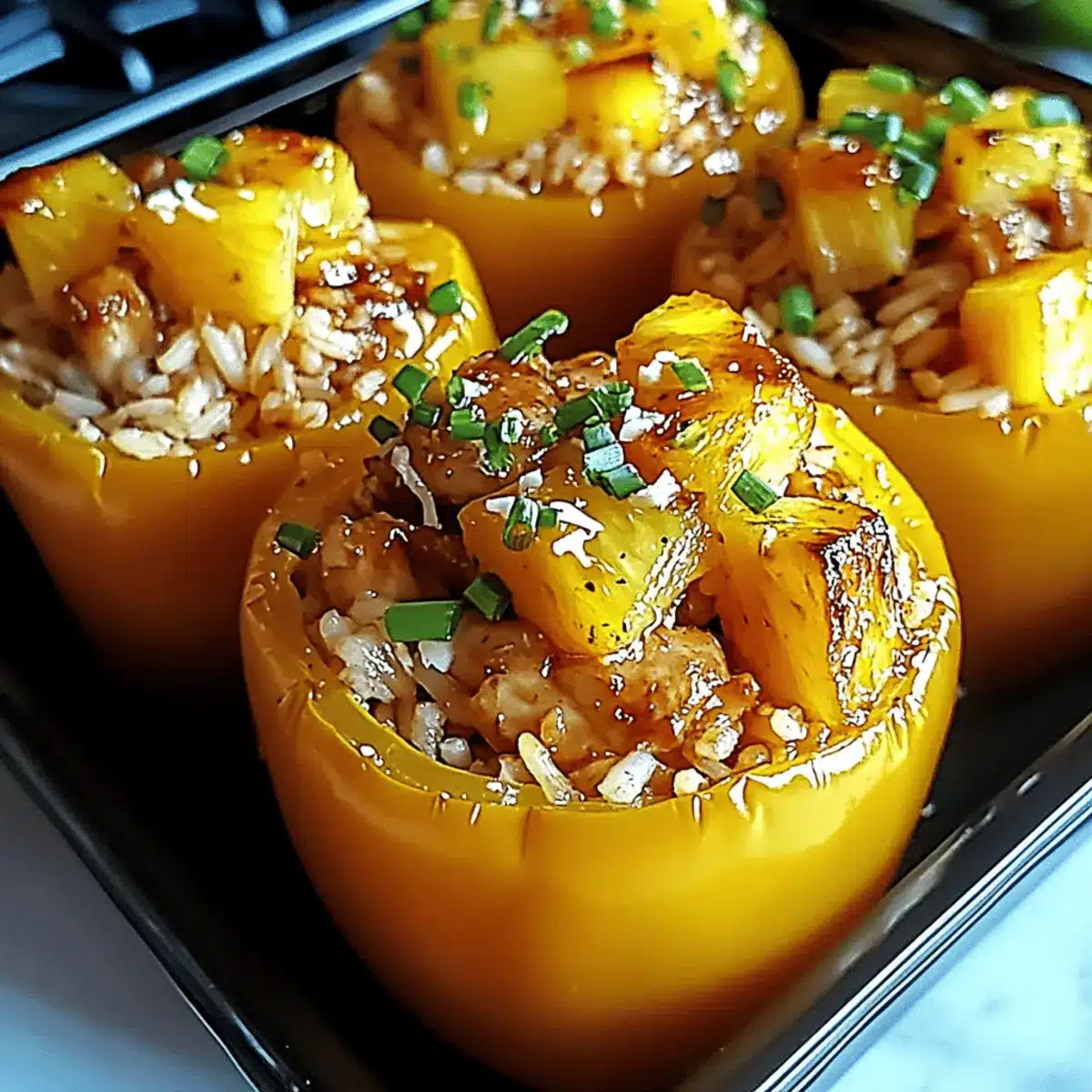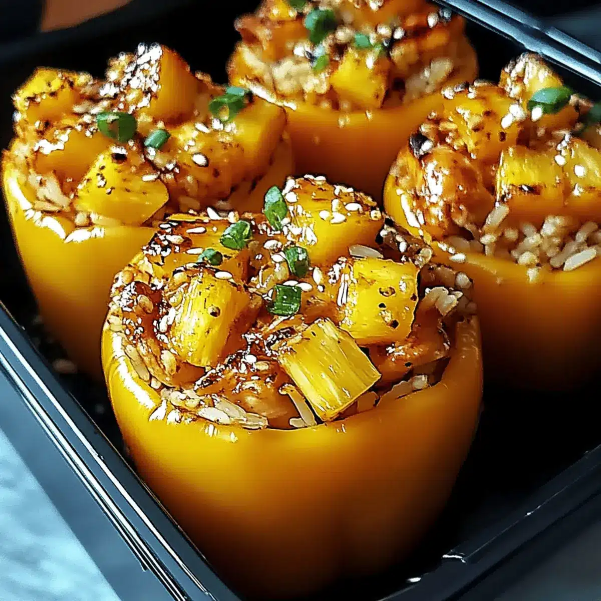 Once your peppers are baked to perfection, let them cool for a few minutes before serving. You can garnish them with additional pineapple chunks or sliced green onions for a pop of color and extra flavor. Get ready to dig into your vibrant, tantalizing Teriyaki Pineapple Chicken and Rice Stuffed Peppers!