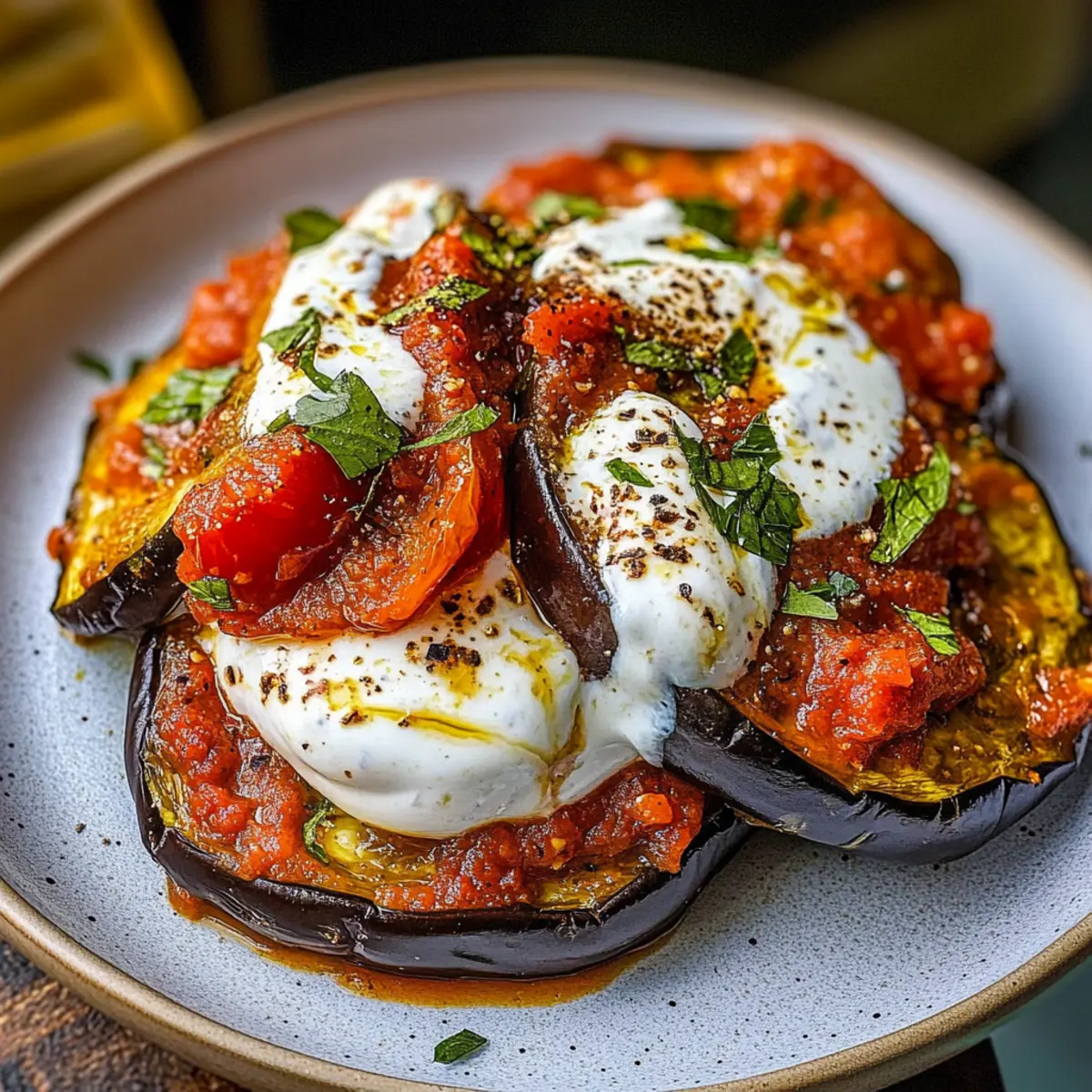 In a serving dish, spread a generous layer of the creamy yogurt sauce on the bottom. Arrange the crispy fried eggplant slices over the yogurt, then spoon the warm spiced tomato sauce generously on top. Don’t forget to leave some yogurt for the final touch; create a layer over the sauce for extra creaminess.