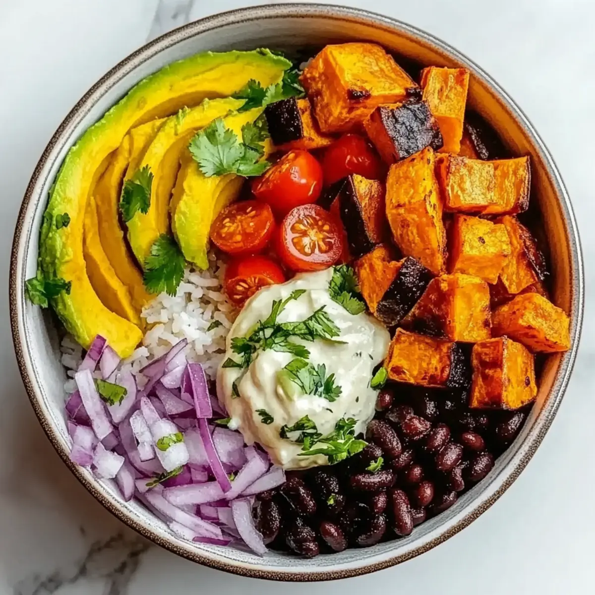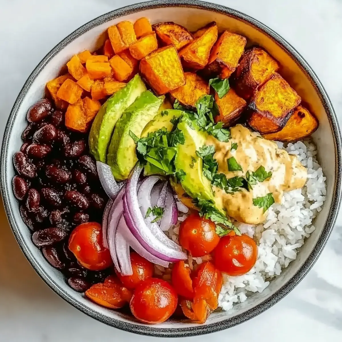 Once the sweet potatoes are done roasting and the rice is ready, it’s time to assemble your Vegan Sweet Potato Burrito Bowl. Start with a generous scoop of warm rice as the base in your favorite bowl. Layer it with roasted sweet potatoes, black beans, corn, diced red onion, cherry tomatoes, avocado slices, and a sprinkle of fresh cilantro for a burst of flavor and color.